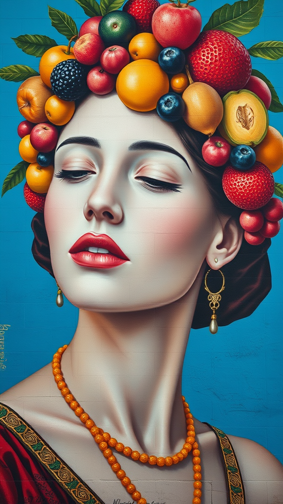 A mural depicting a woman with porcelain skin, adorned in a detailed tiara of assorted fruits, set against a vibrant blue wall. Her serene expression is captured in sharp 32k ultra-high-definition detail. The artwork harmoniously blends inspirations from Ingrid Baars with the rich textures of Benin art, incorporating the diversity and unity seen in melting pots. Echoing the grandeur of Paolo Veronese and created as a commissioned piece, the portraiture employs dramatic chiaroscuro lighting to emphasize her ethereal features. The style remains raw and evocative, maintaining an aspect ratio of 4:5, with subtle creative flourishes enriching the original vision.