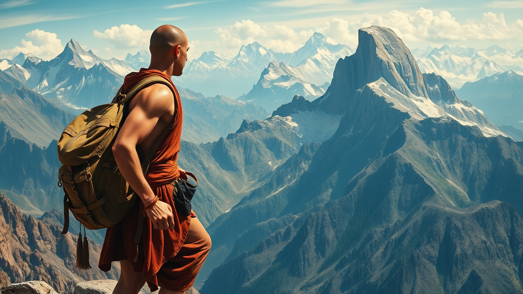 A muscular yet lean male monk traveler with a weathered rucksack, embodying both a serene geisha's grace and the rugged determination of a mountain climber, scales the majestic peaks reminiscent of Albert Bierstadt's painted mountains. Seen from a bird's eye view, this hyper-realistic oil painting captures the intricate beauty and grandeur of the scene, combining the dynamic energy and adventure associated with a piece by Frank Frazetta.