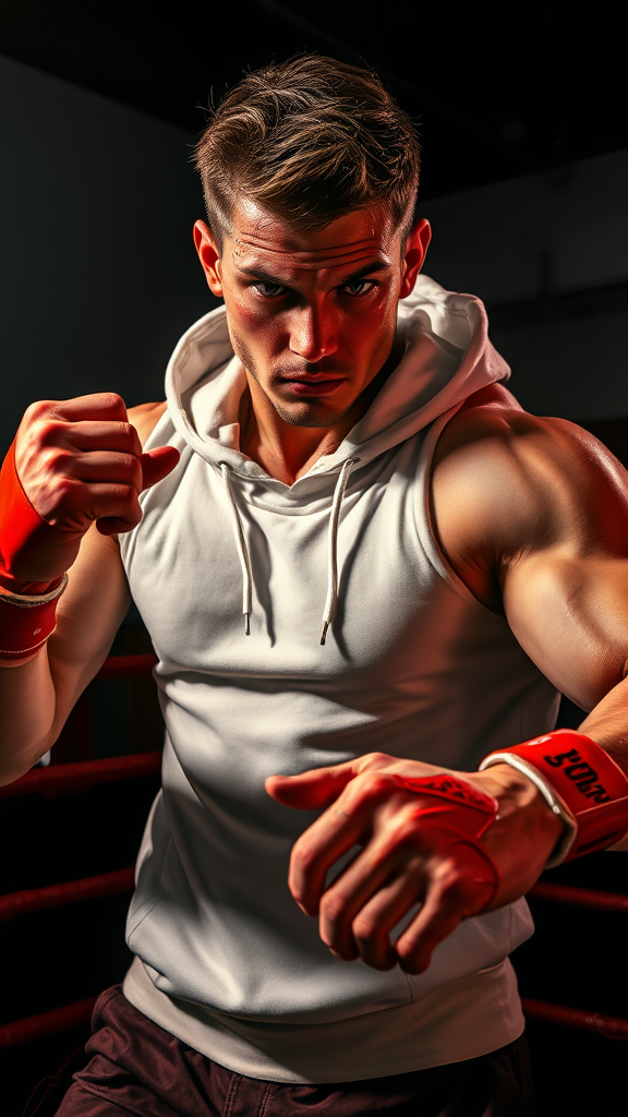 A muscular young man with short brown hair stands in a dark boxing club background, exuding a tough and intense gaze. His strong, calloused hands suggest years of fighting experience, each finger marked by scars and battle-worn skin. Sweat glistens on his face, enunciating the bruises and marks signifying his seasoned fighter status. He wears a striking white dragon hoodie that contrasts vibrantly with the blood_red hues permeating the scene. In a dynamic, epic action pose, the speed and blur effect suggests movement as he engages in a fierce battle. The setting is shrouded in dark shadows, with cinematic lighting casting dramatic highlights on his powerful form. The angle captures him mid-motion, accentuating the extreme details of his physique and scars, reflecting the CarnageStyle influence in bold, expressive brushstrokes and vivid colors, echoing the Prokoko style. The artist creatively interprets the background while maintaining the core concept of intensity and dynamic action.