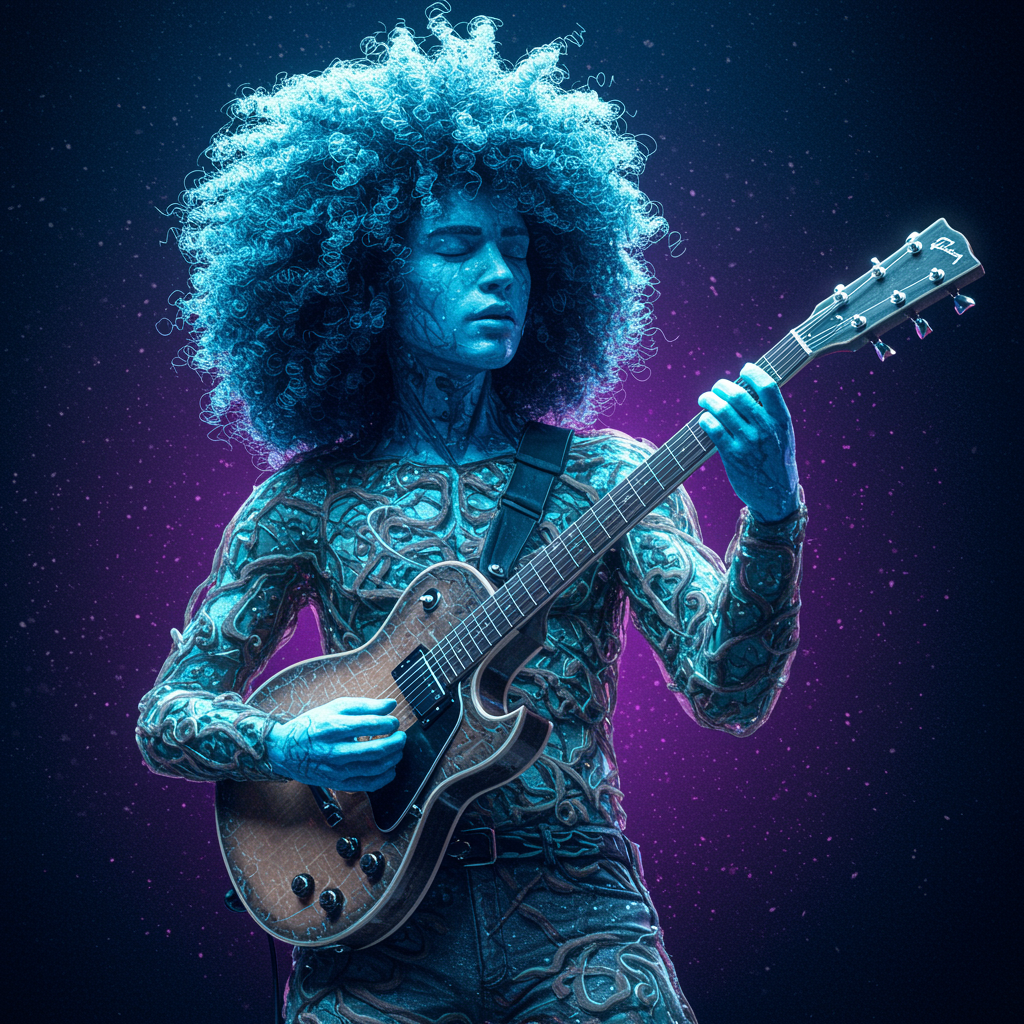 A musician with curly hair, crafted in the style of Beeple, emitting a vibrant true blue glow, showcasing hyper-realistic detail, sculpted with elaborate patterns. The composition features bright gray and electric purple hues intertwined within intricate networks and delicate layers, capturing a sense of dynamic energy and artistic complexity, enhanced with subtle yet imaginative modifications while preserving the core vision.