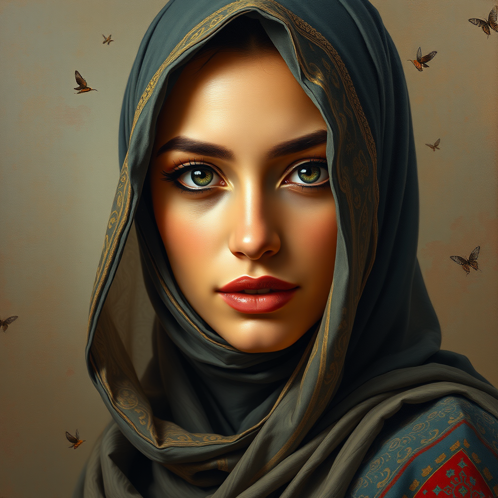 A Muslim Arab woman, model-style, full-body portrait of exquisite artwork, showcasing beauty and grace. This professional, majestic oil painting captures the elegance of renowned artists like Ed Blinkey, Atey Ghailan, and Studio Ghibli. The artistic style is reminiscent of Jeremy Mann, Greg Manchess, and Antonio Moro, featuring intricate details and sharp focus. The artwork is dramatic and photorealistic, trending on ArtStation and CGSociety. It embodies high detail and a sharp, vivid focus, crafted with a rich, colorful palette and delicate brushwork. The canvas frame serves as a window into a world of beauty, capturing a realistic yet artistically enhanced portrayal, avoiding exaggerated features and maintaining a harmonious proportion throughout, ensuring a depiction that is both realistic and artistically enchanting.