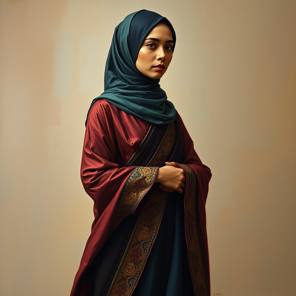 A Muslim Arab woman standing with grace and elegance, portrayed in a modelshoot style. This full-body photo captures the essence of beauty in a majestic oil painting reminiscent of Ed Blinkey and Atey Ghailan, infused with the whimsical touch of Studio Ghibli. The artwork evokes the finesse of Jeremy Mann, Greg Manchess, and Antonio Moro, featuring intricate details and sharp focus, creating a dramatic and photorealistic image. Celebrated on platforms like ArtStation and CGSociety, this masterpiece combines Asian and Black influences on a canvas backdrop. The painting embodies high detail and vibrant colors, avoiding any distortions or unrealistic features, preserving the purity of human anatomy with well-drawn hands, feet, and faces. A professional artistic tribute to the harmonious blend of cultures and artistic styles, capturing the allure and dignity of a Muslim Arab woman with precision and artistic integrity.