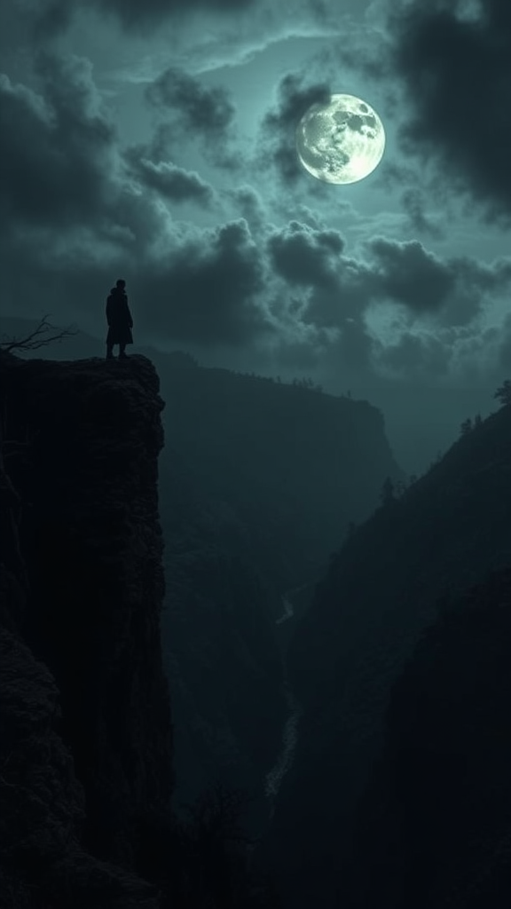 A mysterious and cinematic landscape features a lone figure standing on a rugged cliff, gazing out over a shadowy, foreboding valley. The figure is silhouetted against a turbulent sky, where dark clouds gather ominously around a luminous full moon, casting an ethereal glow over the scene. Below, the valley lies enveloped in darkness, revealing glimpses of gnarled trees, sharp rocks, and deep, winding ravines that snake through the gloom. The composition is imbued with a palpable sense of mystery and tension, enhanced by the subtle rustling of leaves and the distant howl of the wind, creating an atmosphere both captivating and eerie.