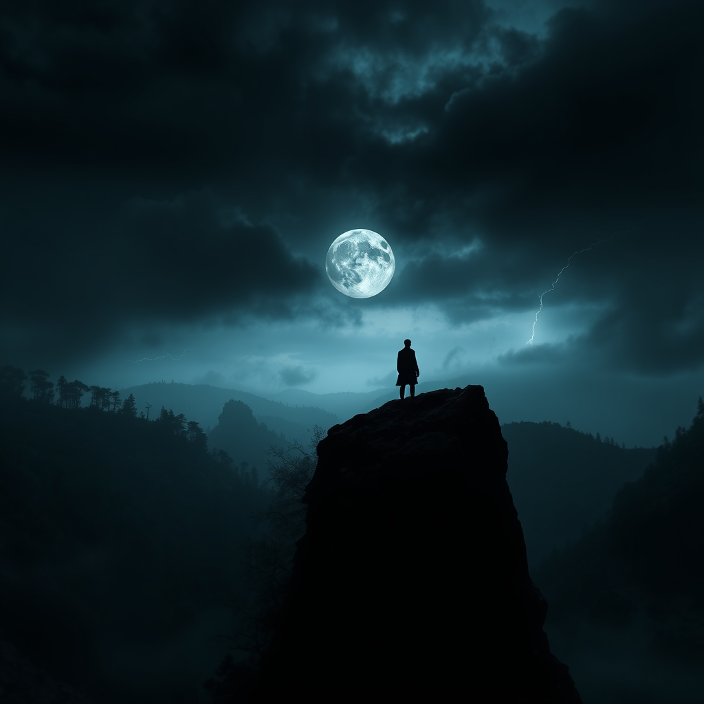 A mysterious and cinematic landscape showcases a solitary figure poised on a craggy cliff, surveying an ominous and shadowy valley. The figure remains a silhouette against a tempestuous sky, with a full moon bathing the scene in an ethereal glow. The valley is cloaked in shadow, revealing glimpses of gnarled trees, jagged rocks, and hidden ravines lurking in the dimness. The composition is steeped in darkness and drama, exuding a palpable atmosphere of suspense, with occasional flickers of distant lightning illuminating the backdrop.