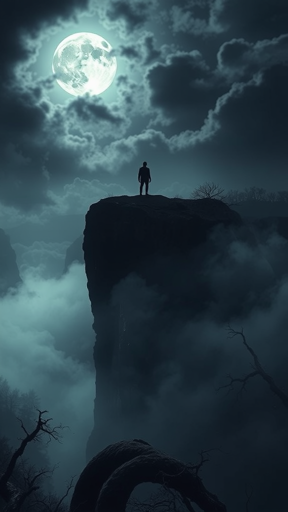 A mysterious and cinematic landscape unfolds with a lone figure standing on a towering cliff, peering into a vast, foreboding valley. The silhouette of the figure is stark against a brooding, cloud-laden sky, as the full moon casts a haunting glow over the scene. Veils of shadow blanket the valley below, revealing glimpses of gnarled trees, sharp rocks, and serpentine ravines that weave through the murk. The atmosphere is suffused with darkness and tension, creating an intense and immersive mood. The sense of scale is palpable, with the towering cliff and expansive valley amplifying the enigmatic aura of the scene.