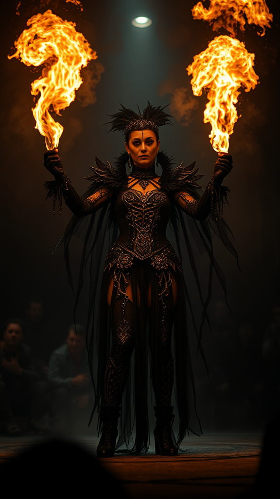 A mysterious and gothic female performer dressed in macabre attire stands center stage at a shadowy circus spectacle, her intricate costume adorned with grotesque details. She commands attention as she unleashes a spectacular stream of fire, illuminating the dim surroundings with a menacing glow. The atmosphere is charged with horror and suspense, enhanced by dramatic, high-contrast lighting that casts sinister shadows. The scene is captured in ultra-high-definition photorealism, with cinematic noise adding a gritty texture to the image, emphasizing the eerie allure of this dark, otherworldly performance.