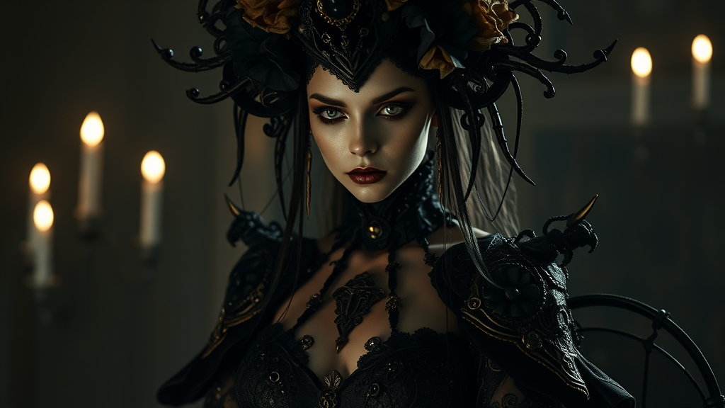 A mysterious and otherworldly female figure adorned in stunningly intricate gothic attire, embodying a macabre and grotesque aesthetic. Her ensemble is rich with occult-inspired designs, exuding an air of dark enchantment and horror. The photorealistic scene is bathed in dramatic, low-key lighting that casts sinister shadows across her intricately detailed garments. The cinematic ambience is enhanced by subtle noise, lending a tactile, almost tangible quality to the image, as if captured in a high-resolution 8k frame.