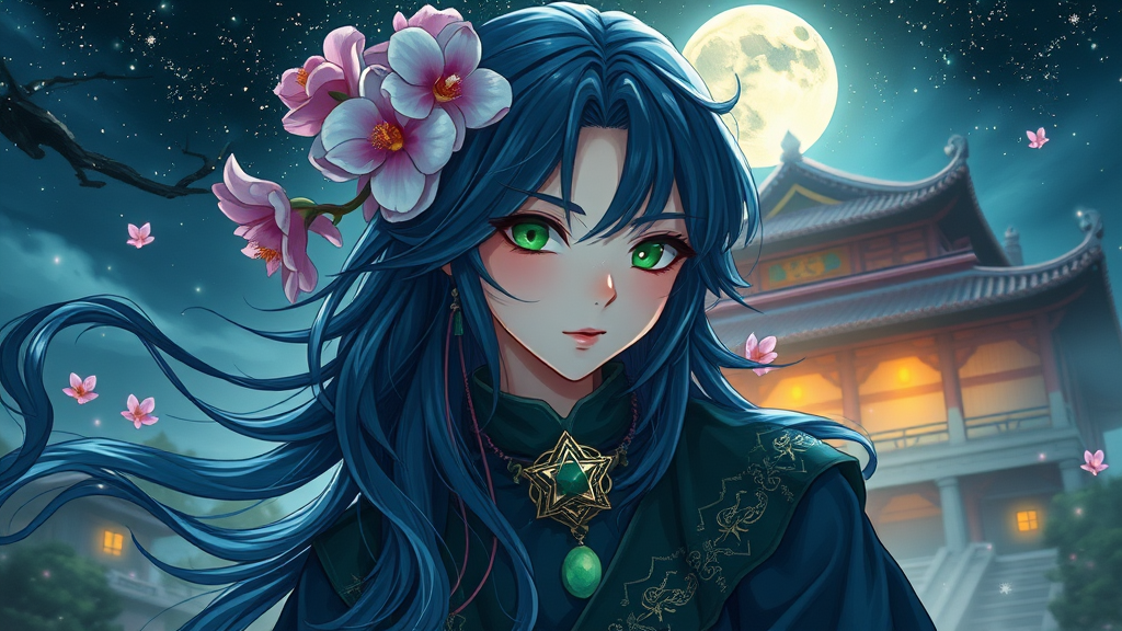 A mysterious anime sorcerer from the Tang dynasty adorned with an orchid hair accessory and a jade charm, stands under the moonlit sky of an ancient temple. They have striking emerald green eyes and midnight blue hair that cascade around a celestial star ornament. The scene is set in a mystical landscape reminiscent of Kay Nielsen's art, with flowing robes that capture the ethereal essence of the moment. The sorcerer gazes directly at the viewer, their presence captured in a wide-angle portrait. The atmosphere is imbued with mystical lighting, rendered in mixed media, where orchid blossoms swirl around like enchanted sparks amidst light shining like countless constellations.