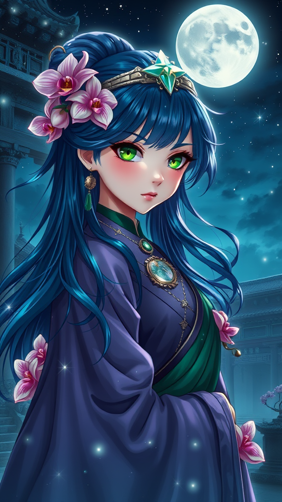 A mysterious anime sorceress from the Tang dynasty adorned with an orchid hair accessory and a jade amulet, stands at the heart of an ancient temple under the moonlit sky. Her emerald green eyes and midnight blue hair shimmer with otherworldly allure, complemented by a celestial star ornament that crowns her presence. Set against a mystical landscape, her flowing robes dance with the whispers of a midnight breeze. She gazes directly at the viewer, her expression enigmatic and inviting. The scene is illuminated with mystical lighting, capturing the essence of Kay Nielsen's artistic style. Orchid blossoms drift on invisible currents like sparks of magic, while the shining light outlines her form as if surrounded by a thousand constellations. Mixed media rendering enhances the ethereal quality of this wide-angle portrait, infusing an atmosphere of ancient wonder and enchantment.