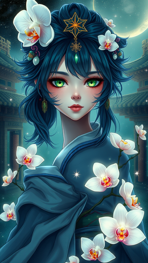 A mysterious anime sorceress from the Tang dynasty with an intricately designed orchid hair accessory and a radiant jade charm, standing at midnight in an ancient temple. Her emerald green eyes gleam with ancient wisdom, contrasting beautifully with her midnight blue hair. A celestial star ornament graces her forehead, casting a gentle glow over the mystical landscape. Inspired by the style of Kay Nielsen, her flowing robes catch the ethereal light, creating an otherworldly atmosphere. She gazes directly at the viewer, surrounded by orchid blossoms that sparkle like magical sparks. The lighting shimmers like a thousand constellations, capturing the essence of mystique and wonder in this mixed media rendering, with a wide angle, portrait orientation that enhances the expressive style.