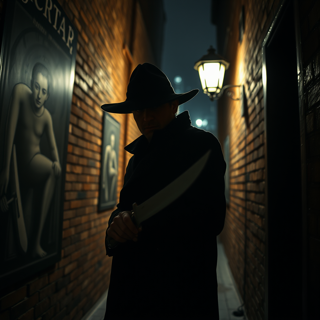 A mysterious assassin in a dimly lit alleyway holds a finely crafted knife, his silhouette framed by intricate artwork on the surrounding brick walls. The scene captures a Rutkowski-inspired cinematic atmosphere with a shallow depth of field, highlighting the intense expression on the man's face. Subtle light glows from a nearby streetlamp, casting dramatic shadows that blend realism and artistry, as if edited in Lightroom for a noir aesthetic.