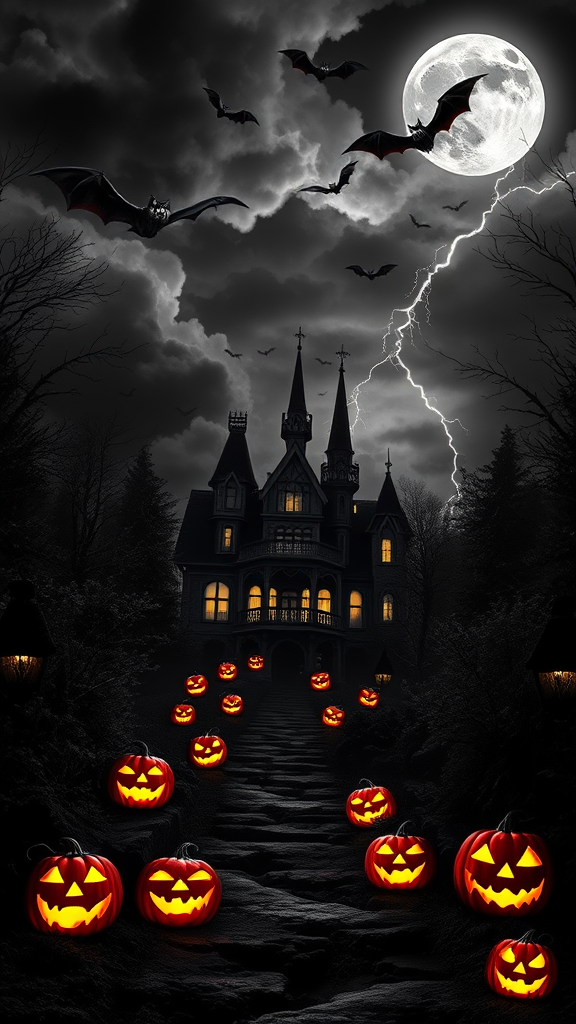 A mysterious black and white haunted mansion looms under a turbulent, stormy sky, surrounded by a dense, eerie forest. Vibrant, glowing jack-o-lanterns with mischievous faces illuminate the path, casting flickering shadows on the ground. Bats flutter chaotically across the scene, silhouetted against a full, ghostly moon. Thunder rumbles in the distance as lightning sporadically reveals the haunted landscape below. The atmosphere is charged, creating an electrifying blend of the supernatural and the unknown.