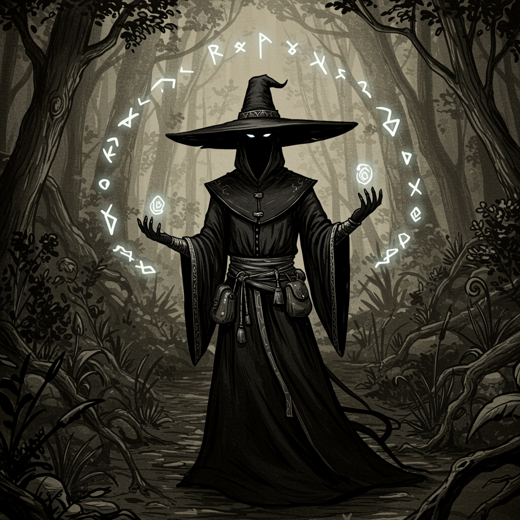 A mysterious black mage with a wide-brimmed hat stands in a shadowy, enchanted forest, their piercing eyes glowing beneath the hat's brim. The scene is rendered in an intricate ink style, reminiscent of classic fantasy illustrations, where dramatic lighting highlights the contrast between the mage's dark robes and the dappled light filtering through the trees. In a wide-angle view, magical runes float around the mage, casting an ethereal glow. The atmosphere is both mystical and foreboding, captured in stunning 4k detail.