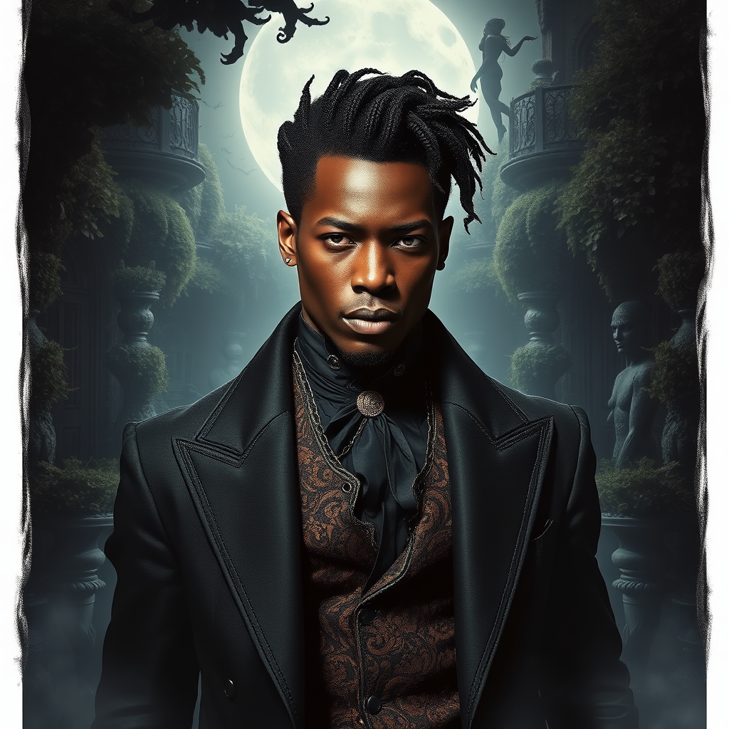 A mysterious Black man exudes elegance in a gothic wonderland, surrounded by dark, opulent architecture and lush, shadowy gardens that whisper of ancient secrets. He's adorned in avant-garde fashion, a mix of rich, textured fabrics and intricate accessories, blending classic Victorian elements with modern, edgy designs. Shadows play across his face, while moonlight catches on the metallic threads of his ensemble, highlighting his striking presence in this ethereal realm where history and fantasy intertwine.