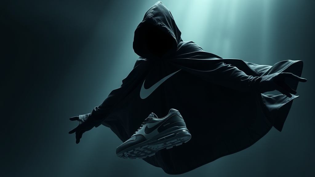 A mysterious dark cloaked figure levitates with the iconic Nike swoosh subtly integrated into the fabric of the cloak, as it opens an infinite void ahead. Rendered in stunning 3D octane style, the scene captures high detail and immersive 8k resolution with mesmerizing volumetric lighting. The cloak's texture intertwines with the sleek design elements of Nike Air Max sneakers, adding a contemporary twist to the enigmatic ambiance.