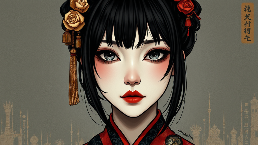 A mysterious dark-haired girl adorned in Asian-inspired attire is depicted in a subtle ink application style, blending elements of appropriation art and gothcore aesthetics. She embodies the intricate craftsmanship of ZBrush character caricatures, with a focus on expressive portraitures embedded with hidden meanings. Her painted illustration captures an ethereal ambiance, where tradition meets modern subcultures, evoking a sense of enigmatic allure and narrative depth.
