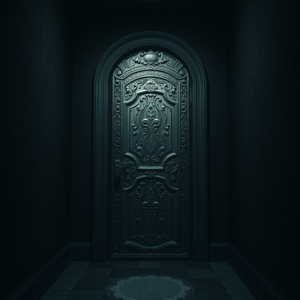 A mysterious door stands at the end of a long, shadowy hallway, its surface covered in intricate carvings that appear to shift and change when viewed from different angles. The air hums with a faint, otherworldly energy as you approach, inviting you to uncover the secrets hidden beyond.