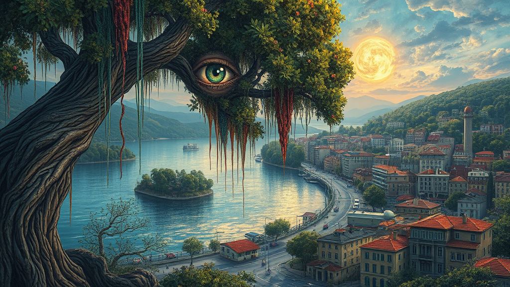 A mysterious eye nestled in a tree overlooking a shimmering lake, painted in the intricate style of Brian Despain, with vibrant colors dripping like liquid dreams. The scene unfolds into expansive landscapes that breathe life into a surreal urban enclave, echoing the fantastical worlds of Mars Ravelo and Mati Klarwein. A harmonious blend of nature and cityscape, with details so finely wrought that each element tells its own story. The atmosphere feels otherworldly, as if part of an enchanting mythology, where the mundane and the extraordinary coexist in a delicate balance under a strange, ethereal sky.
