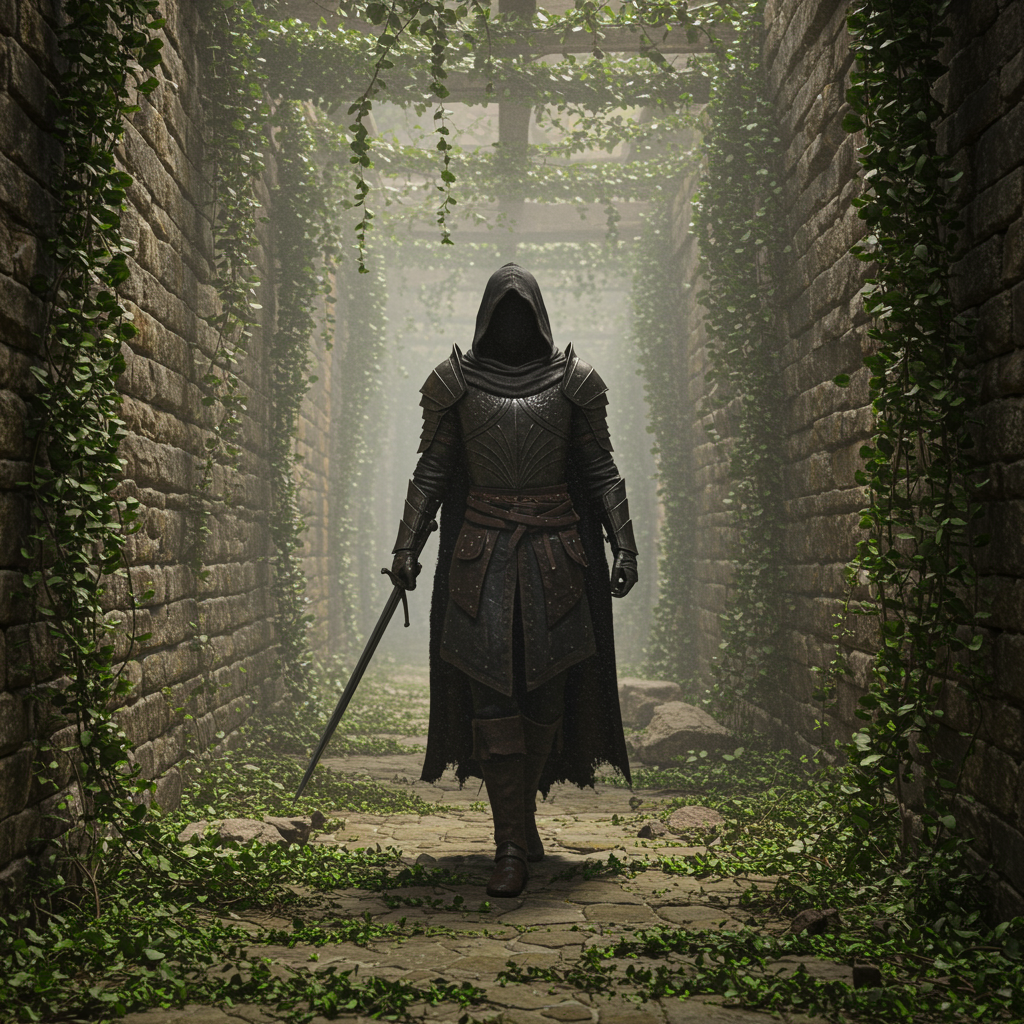 A mysterious figure clad in dark, intricately designed armor, with a shadowy hood obscuring their face, strides purposefully down an ancient stone corridor. The setting is shrouded in thick mist that weaves through lush, overgrown vines and creeping ivy clinging to the weathered stone walls. In the figure's grip, a gleaming sword catches the dim light filtering through the dense foliage above, casting a soft, enigmatic glow. The atmosphere is charged with an aura of ancient magic and forgotten secrets, as though the corridor itself holds untold stories waiting to be uncovered.