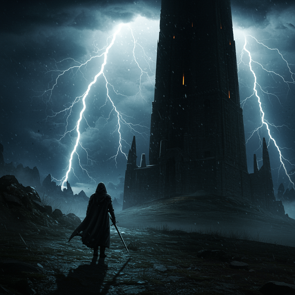 A mysterious figure clad in flowing black robes walks toward a looming dark tower, illuminated by flashes of lightning in the midnight sky. The scene captures the essence of a Dungeons and Dragons saga, with dramatic rays of shimmering light piercing the stormy backdrop. The landscape evokes the haunting beauty of a Bob Eggleton masterpiece, with echoes of Caspar David Friedrich's romanticism, the dynamic energy of Doug Beekman's work, and the intricate detail that Doug Chiang is renowned for. The close-up scene is rendered in 8k resolution, offering ultra-high detail that brings the ominous night to life, with creative touches that add depth to the shadows and highlights that dance across the scene.