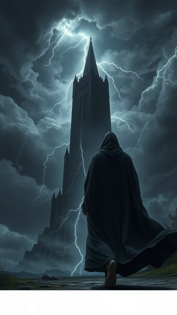 A mysterious figure cloaked in flowing black robes strides purposefully towards a looming dark tower, jagged lightning tearing through the turbulent sky behind them. The scene is evocative of a dark fantasy realm akin to Dungeons and Dragons, where piercing rays of shimmering light occasionally break the brooding clouds. This atmospheric tableau is reminiscent of the dramatic landscapes of Caspar David Friedrich and the dynamic, fantastical worlds of Bob Eggleton and Doug Beekman, with the intricate design sense of Doug Chiang. Captured in ultra-high detail, each fold of the robe and flash of lightning is rendered in breathtaking 8k realism, bringing to life the tension and majesty of this ominous night.