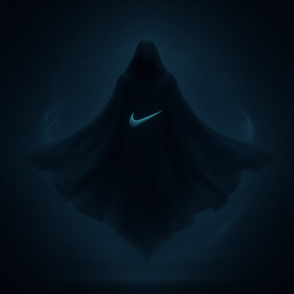 A mysterious figure draped in a dark, intricately textured cloak marked with a prominent Nike swoosh hovers effortlessly, casting an ethereal glow. The fabric appears to shimmer under 3D octane rendering, enhancing the high detail visible at 8k resolution. Volumetric lighting bathes the scene as the figure opens a swirling void that seems to stretch into infinity, its edges twinkling with cosmic stardust. Surrounding the void, subtle hints of Nike Air Max elements weave seamlessly into the fabric, merging the iconic brand with the mystical ambience. The entire scene exudes an aura of dynamic energy, encapsulating the bridging of modernity and the mystical realm.