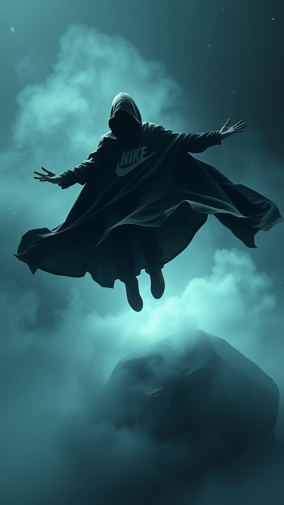 A mysterious figure shrouded in a dark, flowing cloak adorned with the iconic Nike swoosh hovers ethereally, as if defying gravity, at the threshold of an endless cosmic abyss. The scene is meticulously crafted with 3D octane rendering to highlight intricate details, offering a breathtaking 8k resolution experience. Volumetric lighting streams through the scene, casting an otherworldly glow around the figure, who is donning sleek Nike Air Max sneakers. The Nike logo subtly emerges in the surrounding mist, symbolizing the infinite possibilities and dynamic energy embodied by the brand.