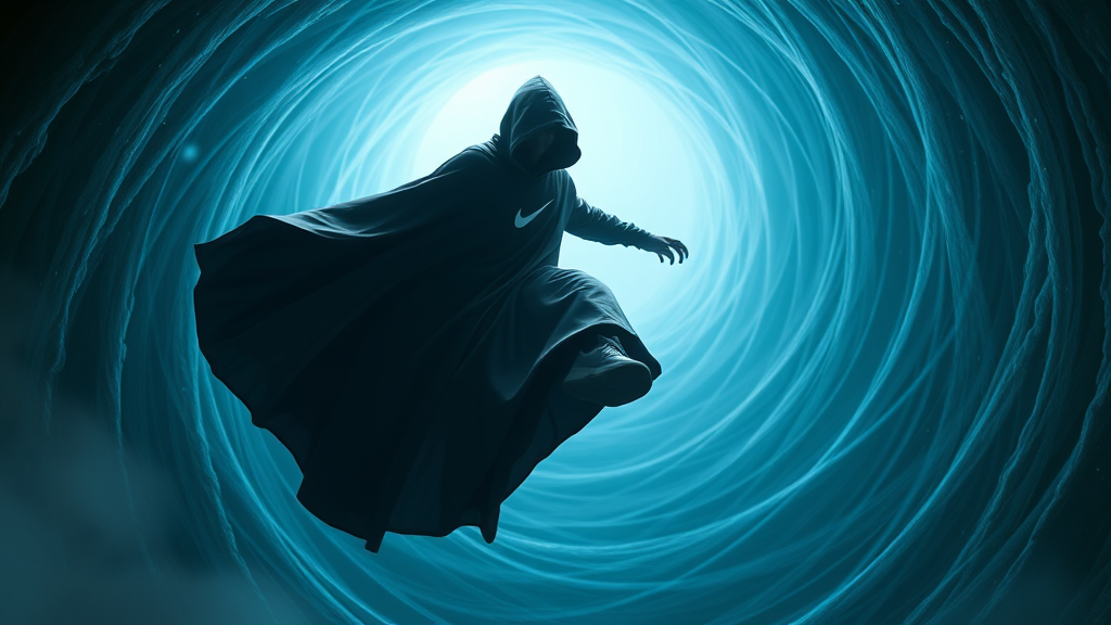 A mysterious figure shrouded in a dark, flowing cloak adorned with a subtle Nike swoosh levitates effortlessly, their presence opening a swirling void that stretches into infinite depths. The scene is rendered with ultra-realistic 3D octane techniques, capturing every intricate detail in stunning 8k resolution. Volumetric lighting bathes the figure in an ethereal glow, highlighting the Nike logo subtly weaved into the fabric. Beneath, the iconic silhouette of Nike Air Max shoes peeks from under the cloak, their design a testament to style and innovation.