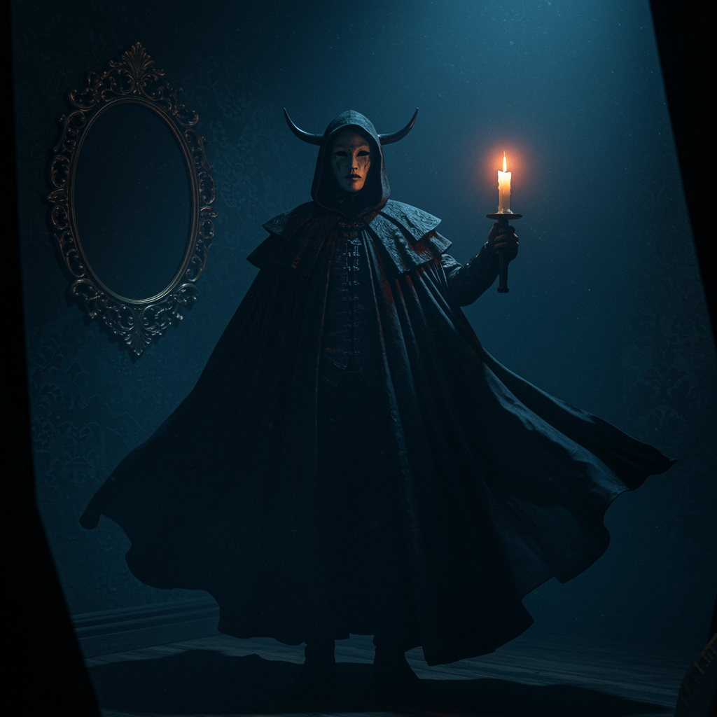 A mysterious figure stands in a shadowy baroque chamber, the air thick with intrigue. They are cloaked in an intricate, dark cape that flows like liquid shadows, a pale mask obscuring their face, its sharp features like a ghostly sculpture. A single candle flickers, casting dramatic and elongated shadows that dance across the walls. An ornate gilded mirror on the wall captures the room’s enigmatic atmosphere, a whisper of secrets untold. The chamber is bathed in a deep blue-black hue, a striking contrast to the warm glow of the candle. The lighting is cinematic, with chiaroscuro techniques creating a Gothic Renaissance aesthetic. The composition is ethereal and enigmatic, each detail rendered with hyper-realistic precision, inviting both awe and mystery.