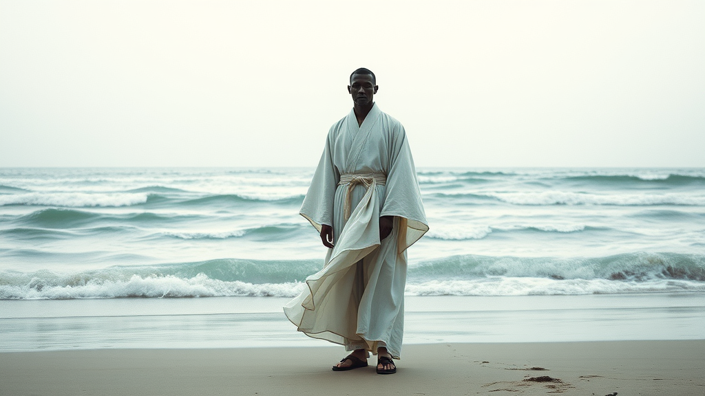 A mysterious figure stands on a serene beach, dressed in flowing Japanese attire that flutters gently in the ocean breeze. Though devoid of facial features, the air around him is charged with deep emotion, as if the very essence of his being is communicating silently with the waves and the horizon. His presence is both haunting and comforting, leaving an indelible impression on the audience who feel as though this enigmatic being is somehow watching over them, connecting through an unspoken bond with the world around him.