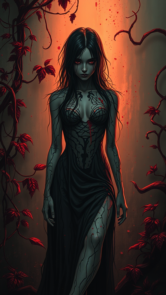 A mysterious girl in a high-cut dress with black, vein-like patterns on her skin, her body dripping with an oily substance. She is surrounded by predatory plants intertwined with ivy, their tendrils reaching towards her. Her face is haunting, set against a backdrop filled with deep shadow and fiery glow, creating a gloomy atmosphere. Red splashes and smudges are scattered across the scene, adding an intense contrast. The setting is illuminated with rim lighting, creating dramatic highlights, complemented by artificial cinematic lighting, capturing the surreal essence of the scene. This artwork embodies fine art illustration with striking 8K detail.
