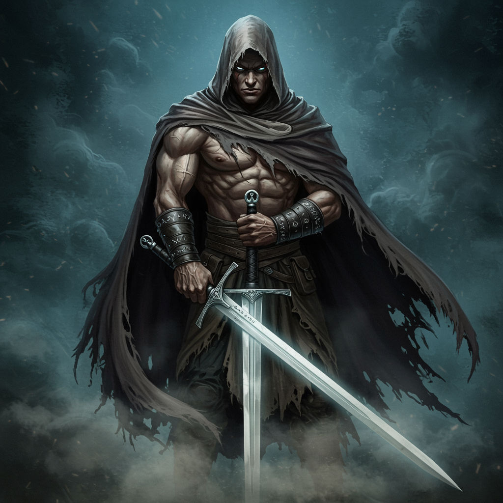 A mysterious hooded figure brandishing a gleaming sword, surrounded by swirling mists, fantasy art inspired by the dynamic style of Simon Bisley, chaos abounding, with a tall, elongated composition. Moonlight casts dramatic shadows on the tattered cloak, highlighting muscular form beneath, eyes glowing faintly in the darkness. A hint of arcane symbols etched into the blade, an aura of otherworldly power pulsating around the character, as if poised at the edge of a legendary, mystical confrontation.
