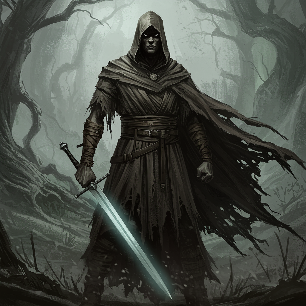 A mysterious hooded figure stands ominously, gripping a gleaming sword in one hand, the blade reflecting a strange ethereal light. Clad in tattered, layered robes that flow like shadows around them, the figure exudes a powerful aura of ancient magic and danger. Their face is obscured by the deep shadow of the hood, with only the glint of intense eyes visible, glowing with otherworldly intent. The atmosphere is charged with chaotic energy, as if the air itself vibrates around this enigmatic character. The landscape is a surreal, stormy backdrop of twisted trees and swirling mists, inspired by the dynamic, gritty style akin to Simon Bisley's artwork, where each stroke seems alive with motion and raw emotion.