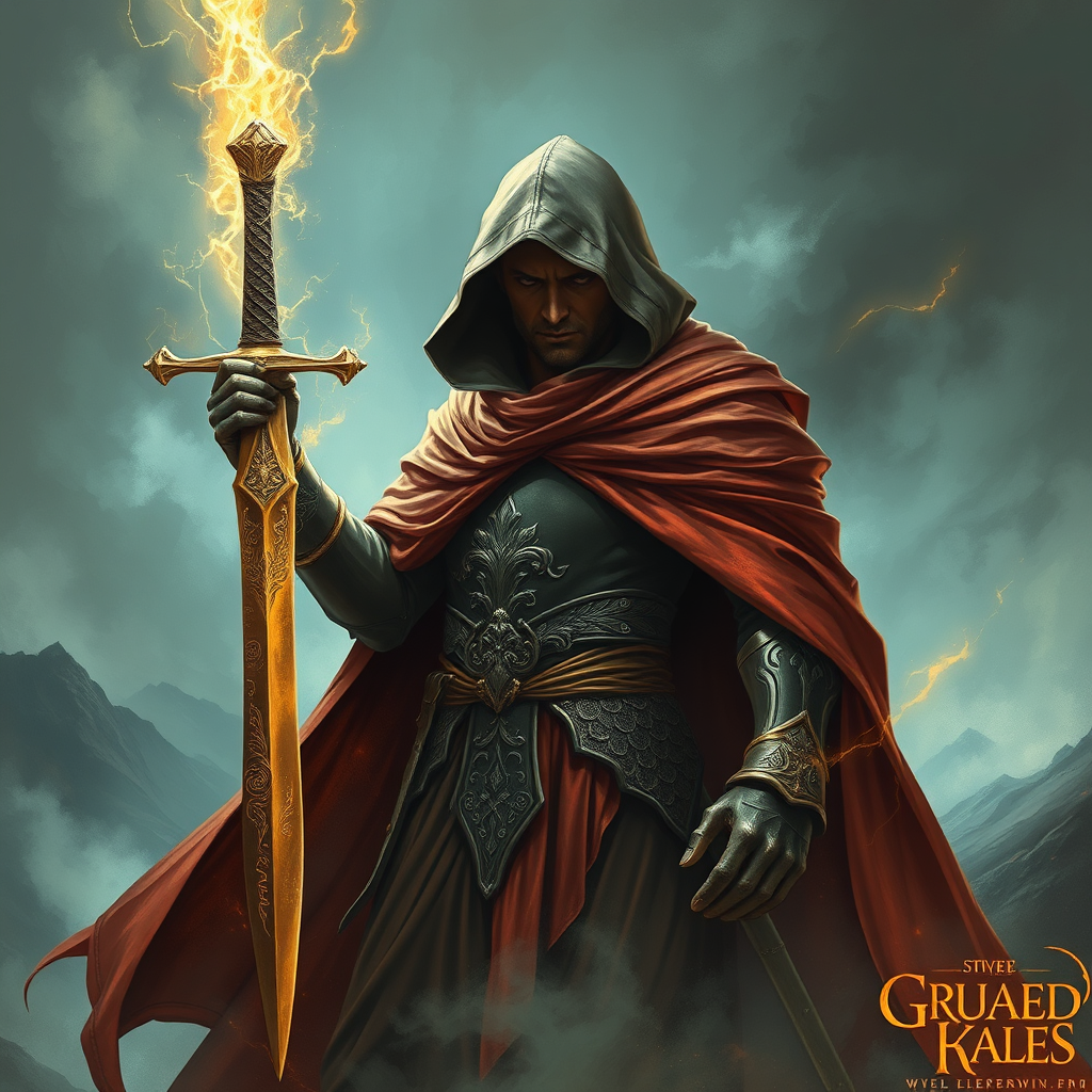 A mysterious hooded figure stands tall, gripping a gleaming sword with intricate engravings in one hand, surrounded by an aura of enigmatic energy. The figure's cloak billows dramatically in the wind, revealing glimpses of ancient armor beneath. They are set against an epic backdrop of swirling mist and distant mountains, all depicted in a bold, intense style reminiscent of Simon Bisley. The atmosphere crackles with chaos, each detail saturated with vibrant, dynamic colors and dramatic shadowing, conveying a sense of mystical power and looming adventure.