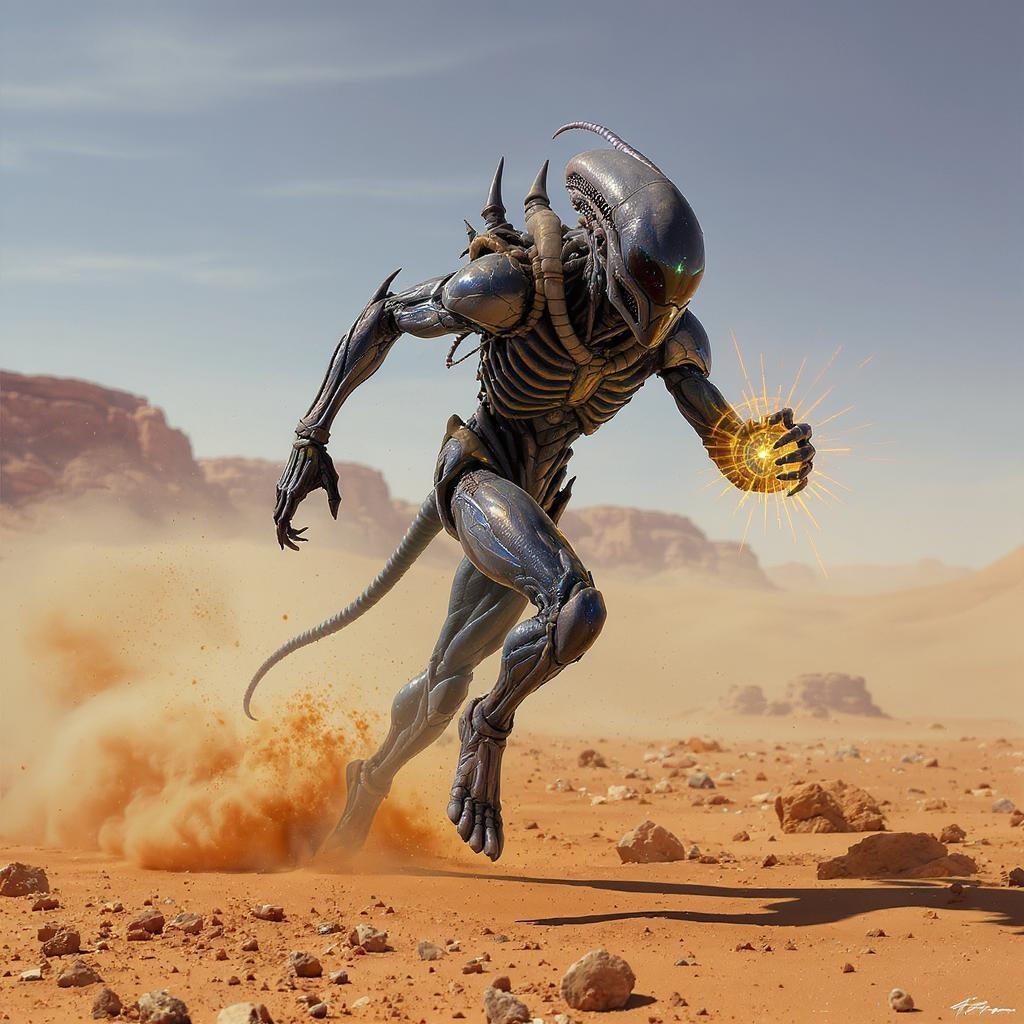 A mysterious humanoid alien sprints across an arid desert landscape, the sun casting sharp shadows across the rocky terrain. Its skin shimmers with iridescent colors under the intense heat, a protective mask covering its face not just from the harsh environment but also to conceal an enigmatic expression. Clutched in its hand is a glowing artifact pulsating with energy, hinting at a secret mission as its elongated limbs propel it forward with incredible speed, leaving a trail of dust in its wake. The alien navigates the unforgiving landscape with an urgency driven by a purpose known only to its kind, its eyes reflecting a cosmos of unspoken mysteries.