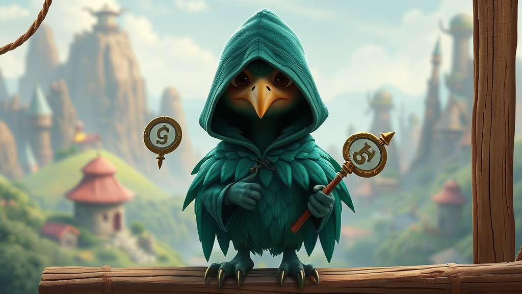 A mysterious Kenku cloaked in a deep emerald hood stands on a wooden canvas frame, their feathers shimmering with iridescent hues. The scene is styled in a blend of cartoonish charm and three-dimensional realism, capturing photorealistic details like the intricate texture of the Kenku's plumage and the subtle play of light and shadow across the fabric of their hood. The Kenku's eyes, large and expressive, peer out with a hint of mischief, while their nimble fingers clutch a small, ornate staff adorned with runes. The background is a whimsical mix of fantastical landscapes, adding depth and intrigue to the character's enigmatic presence.