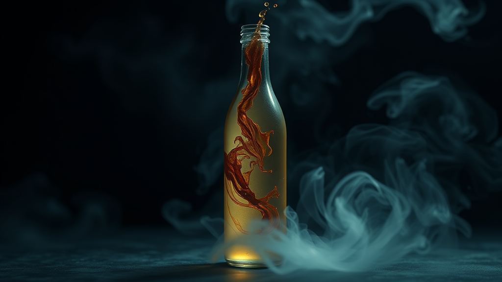 A mysterious liquid swirling in a translucent bottle emerges against a dark, moody backdrop, evoking a sense of intrigue and wonder. The tall, slender shape emphasizes a sense of elegance. The scene is captured with sharp detail and a raw, unfiltered style, enhancing the allure of the enigmatic contents within.