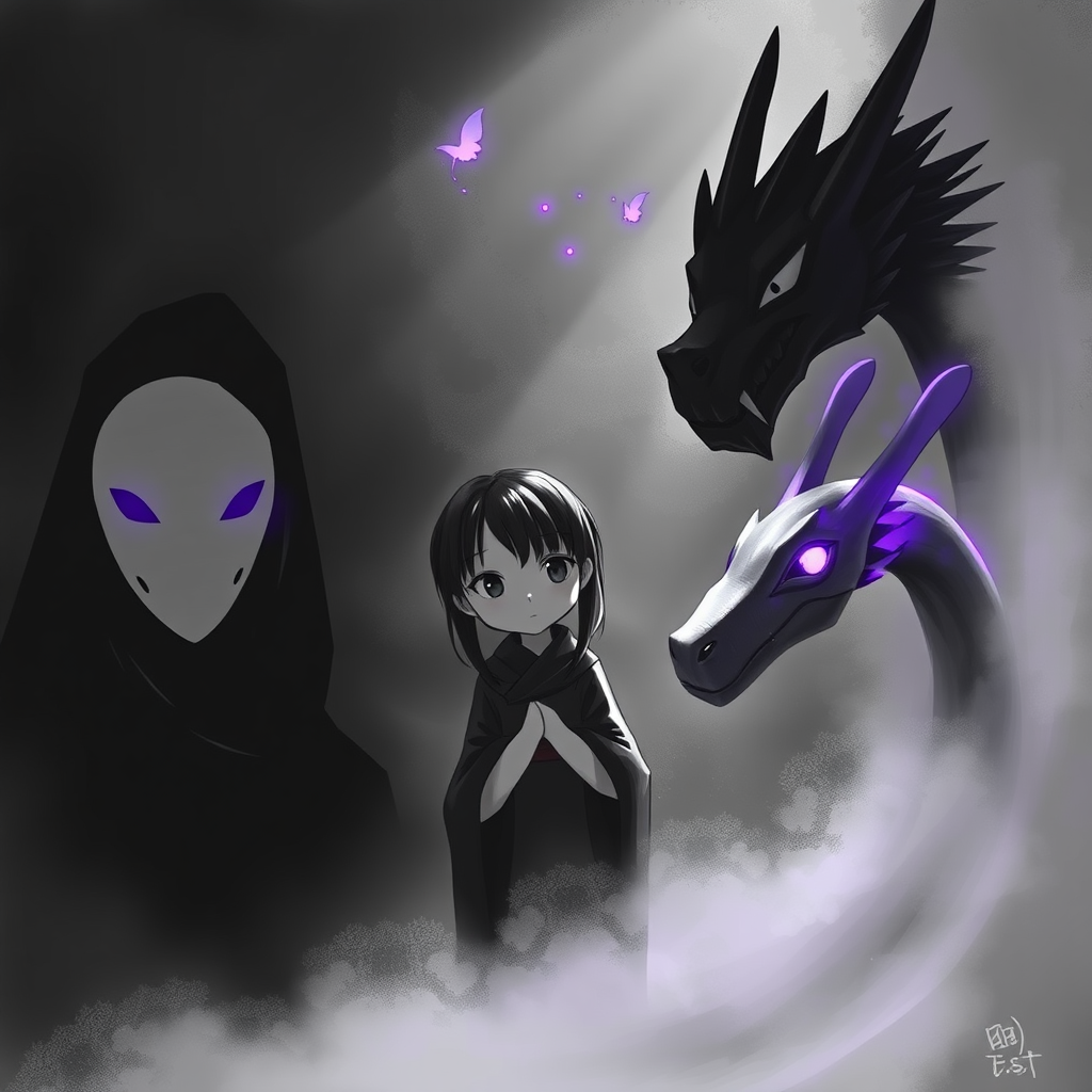 A mysterious monochrome scene depicting characters from Spirited Away, featuring No-Face with a slight purple glow surrounding his mask, Chihiro with strands of violet in her hair, and Haku with delicate amethyst highlights on his dragon scales, all set against a shadowy, ethereal background, where tiny purple-hued spirits drift softly in the air.