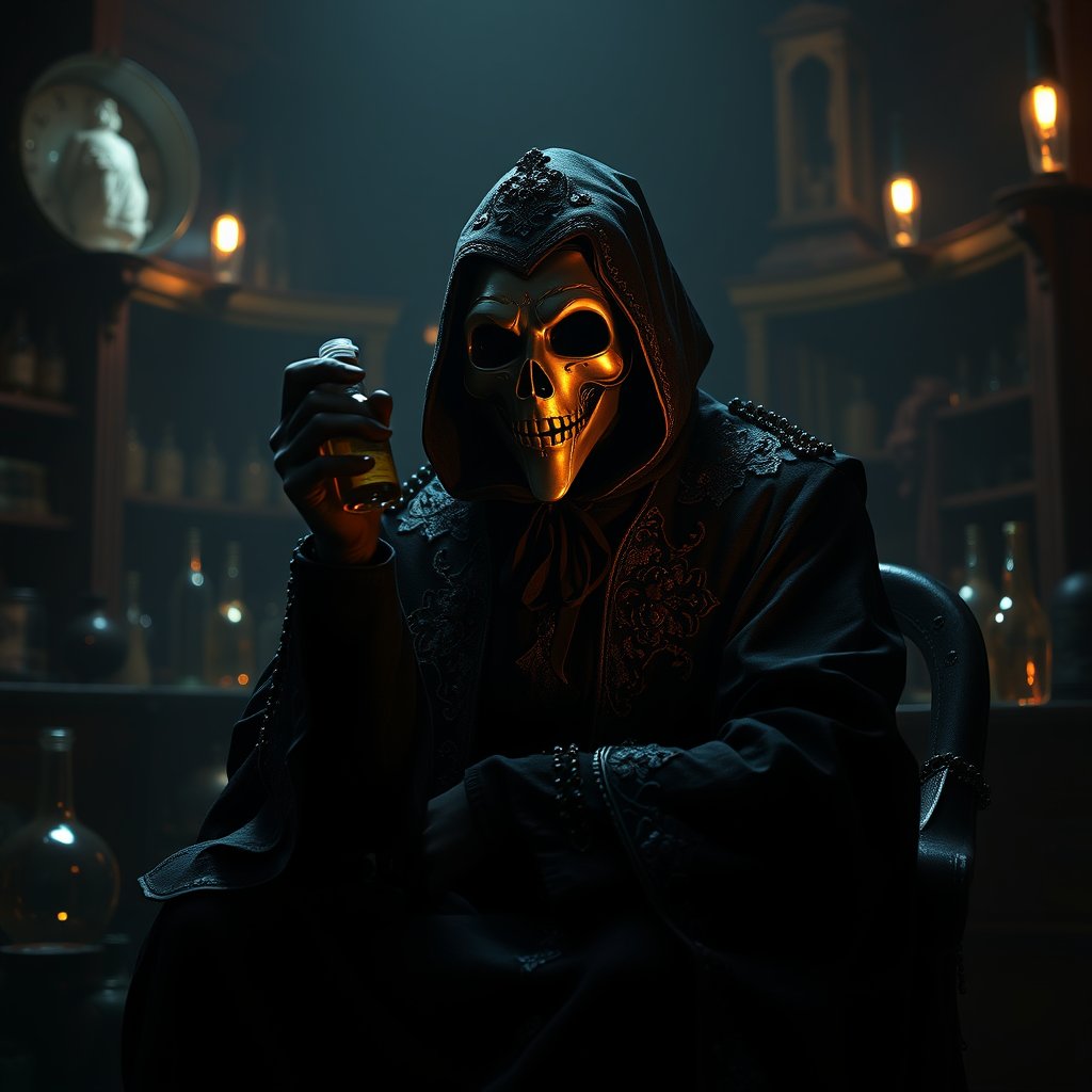 A mysterious plague doctor sits contemplatively in an ancient laboratory, clasping a vial of poison, his intricately designed mask casting long shadows. He wears an ornate black robe adorned with elaborate decorations, each thread shimmering under dim, flickering lights. The room is bathed in ambient occlusion, creating an eerie glow. Reflections dance across the surfaces, driven by ray tracing and Lumen technology. The atmosphere is dense with volumetric lighting, enhancing the mystique, as diffraction patterns and screen space reflections create a mesmerizing effect, akin to a supernova, captured in stunning 8k detail.