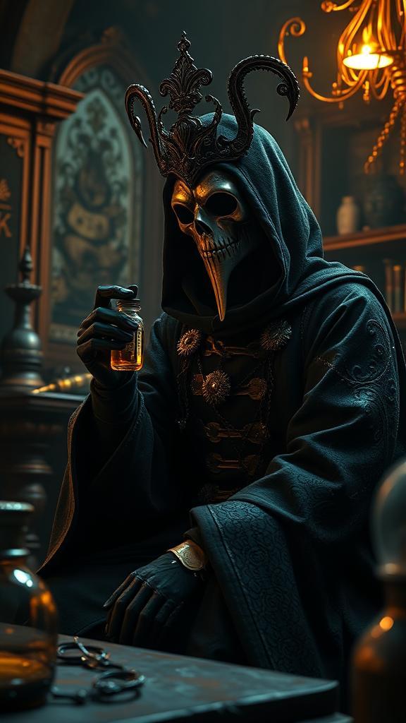 A mysterious plague doctor sits in contemplation, holding a delicate vial of poison in a dimly lit ancient laboratory. The doctor's ornate, intricately detailed mask and lavishly designed black robe exude an air of authority and enigma. The robe is adorned with elaborate decorations, every stitch adding to its grandeur. The setting is a masterpiece of fantasy art, rendered in high definition with incredible attention to detail. Ambient occlusion enhances the atmosphere, with glowing highlights and deep shadows creating a dramatic interplay of light and dark. The scene is rich with shimmering textures, enhanced by ray-traced reflections and nuanced by lumen reflections. Screen space reflections and diffraction grading add layers of depth. A spectacle of energy, akin to a supernova, seems to illuminate the surroundings, captured in stunning 8k resolution. The environment is suffused with volumetric lighting, adding a mystical aura to the moment, as the air itself seems filled with anticipation and mystery.