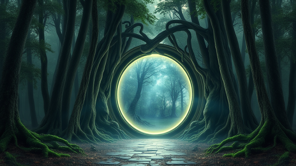 A mysterious portal appears in the heart of an ancient forest, its shimmering surface reflecting a forgotten era, inviting those who dare to step through into a world where time flows differently and secrets of the past await discovery.