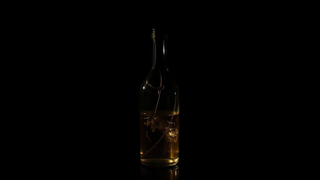 A mysterious potion in a delicate glass bottle, silhouetted against a deep black background, with intricate light reflections playing on its surface, elongated and elegant proportions, showcasing raw, unfiltered beauty.