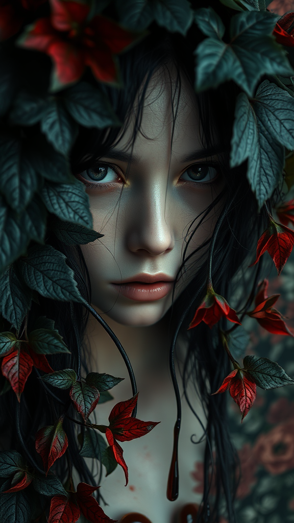 A mysterious scene featuring a girl's face entangled within predatory plants, their black veins visible as they drip oil. Her eyes gaze hauntingly, framed by ivy, with an air of gloom enhanced by dark foliage. The composition boasts splashes of deep red with subtle undertones, set against a floral patterned background. The artwork radiates an eerie yet enchanting atmosphere with the use of rim and artificial lighting, captured in vivid fine art detail, 8K resolution, maintaining an elongated vertical aspect ratio.