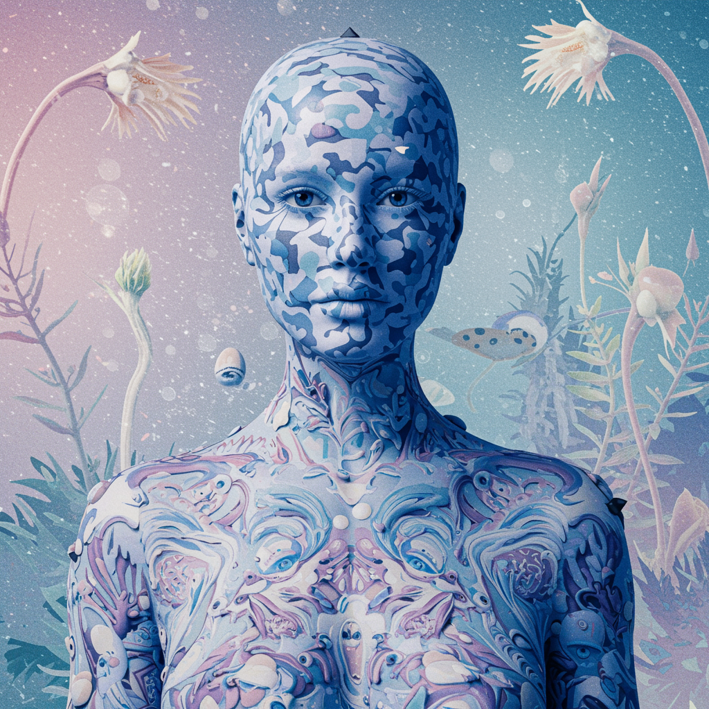 A mysterious spy adorned with delicate blue camouflage on her face, resembling fine porcelain sculpture, embodies elegance and timeless fashion. Her form is exquisite, crafted from mythical creatures and flowing designs, with a pastel-toned palette. Inspired by Oliver Jeffers, she exists in a surreal background, blending raw style and surreal elements into a harmonious vision.