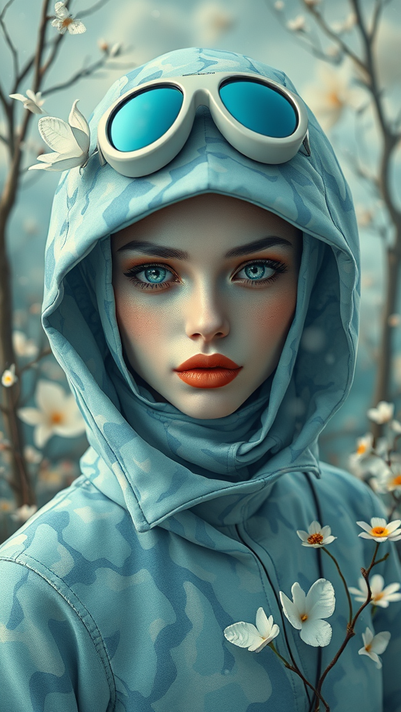 A mysterious spy adorned with subtle blue camouflage resembling delicate porcelain sculpting graces the scene, her face a canvas of elegant figures and timeless fashion. Her presence is an exquisite blend of mythical creatures, with flowing forms and pastel-toned nuances. The surreal background is reminiscent of Oliver Jeffers' artistry, combining enchanting tones and whimsical elements, creating an ethereal vision of intrigue with a hint of magic, set against a strikingly surreal landscape.