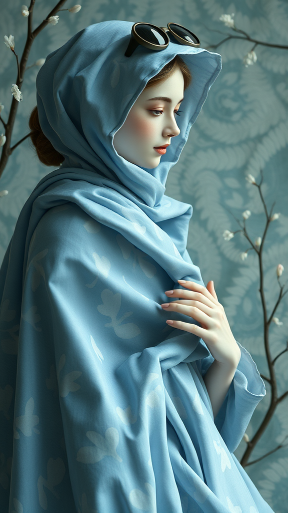 A mysterious spy adorned with subtle blue camouflage resembling delicate porcelain sculpting, her elegant figure draped in timeless fashion, exuding an exquisite aura. She appears as though crafted from mythical creatures, her form flowing gracefully with pastel-toned hues. The surreal background hints at Oliver Jeffers' whimsical influence, blending dreamlike elements in a 9:16 aspect ratio.