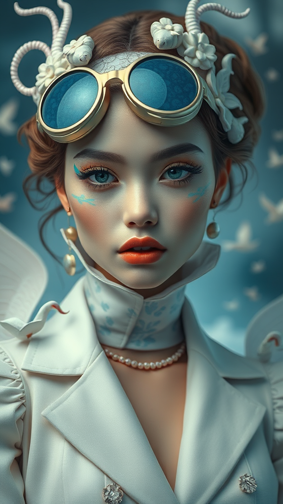 A mysterious spy adorned with subtle blue camouflage on her face, reminiscent of delicate porcelain artistry, with elegant features and a timeless sense of fashion. Her exquisite presence is crafted from mythical creatures and flowing forms, enhanced by pastel-toned hues. The ambiance evokes the whimsical charm of Oliver Jeffers, set against a surreal backdrop, blending elements of intrigue and ethereal elegance.