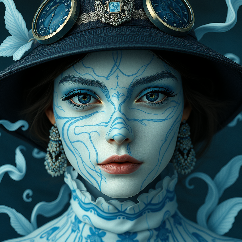 A mysterious spy with an intricate blue camouflage across her face, resembling delicate porcelain art, showcasing elegant figures and timeless fashion. Her features echo the elegance of mythical creatures, with flowing forms and pastel-toned hues. The scene is inspired by the whimsical style of Oliver Jeffers, set against a surreal background with dreamy, flowing elements.