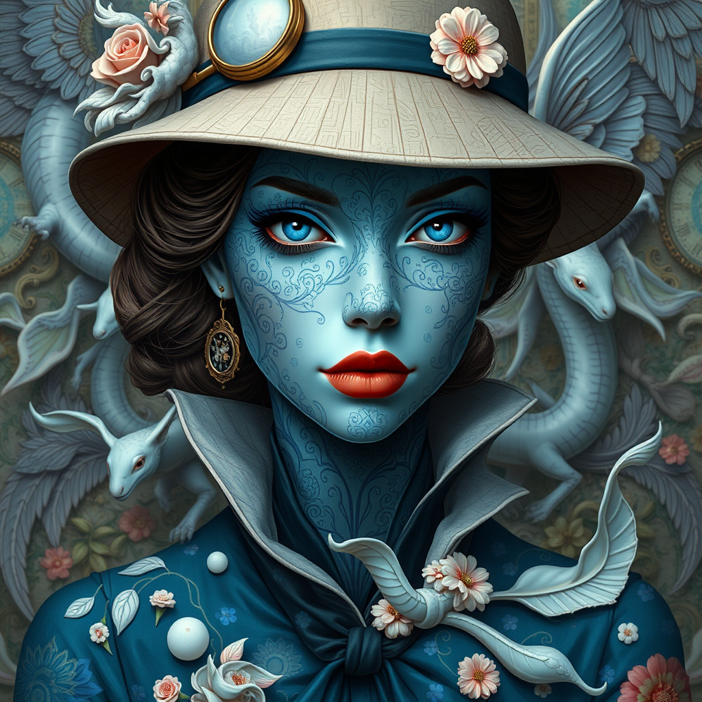 A mysterious spy with intricate blue camouflage on her face, reminiscent of delicate porcelain sculptures, exudes elegance and timeless fashion. Her attire features the exquisite imagery of mythical creatures, with flowing forms in pastel tones. The artwork embodies the whimsical style of Oliver Jeffers, set against a surreal background, capturing the essence of timeless elegance and mystery.