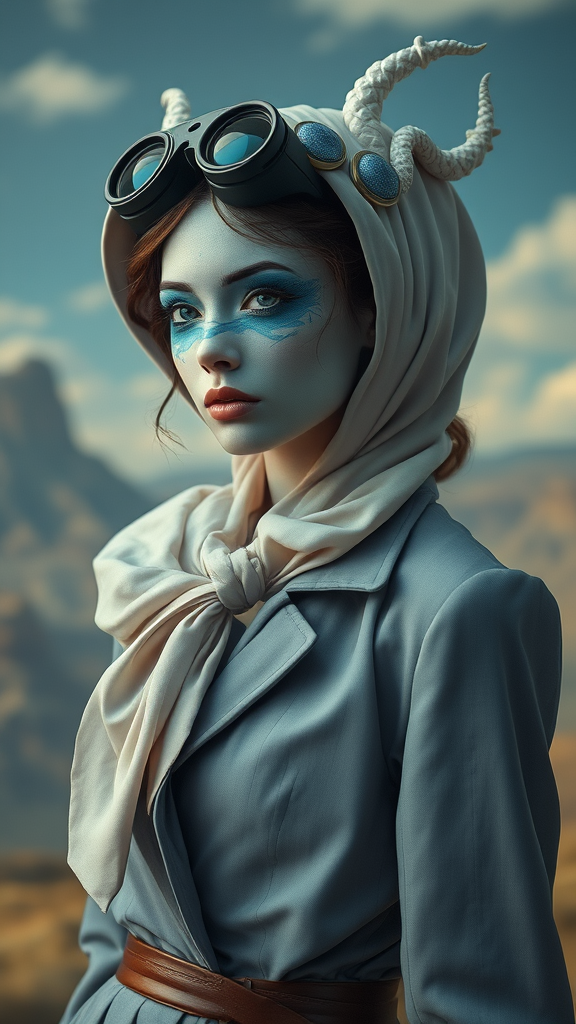 A mysterious spy with subtle blue camouflage on her face, reminiscent of delicate porcelain sculpting, embodies elegance and timeless fashion. Her features, crafted from mythical creatures, blend seamlessly with flowing forms and pastel hues, creating an exquisite vision. Inspired by the whimsical style of Oliver Jeffers, she stands against a surreal backdrop, where dreamlike landscapes merge with reality, evoking a sense of intrigue and wonder.